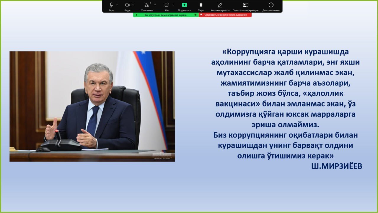 Yig‘ilishga Sanepidqo‘mitaning Korrupsiyaga qarshi kurashish bo‘limi, boshqarma va tuman/shahar bo‘limlari mutaxassislari ishtirok etishdi.