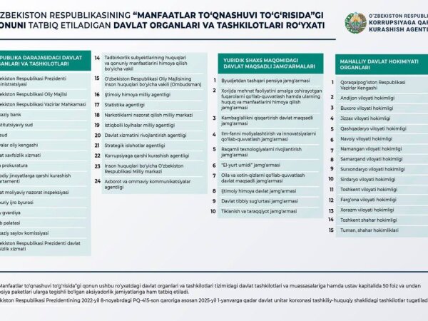 Davlat rahbarining PQ-210-son qarori ijrosini taʼminlash maqsadida “Manfaatlar to‘qnashuvi to‘g‘risida”gi qonun ijrosini tashkil etish ishlarini muvofiqlashtirish bo‘yicha Respublika idoralararo komissiyasi tomonidan qonun tatbiq etiladigan davlat organlari va tashkilotlarining aniq ro‘yxati tasdiqlandi.